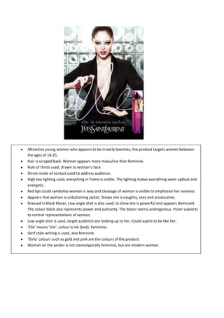 The document analyzes a magazine advertisement featuring a young woman. Several techniques are used in the advertisement to portray the woman as sexy yet powerful, including her direct gaze at the audience, visible cleavage, unbuttoned jacket, and low camera angle that positions the viewer as looking up to her. While her masculine style with scraped back hair subverts traditional feminine representations, the use of red lips, pink and gold colors, and feminine font and magazine name still connect her to femininity. The advertisement aims to portray a modern woman who appeals to the target 18-25 year old female demographic.
