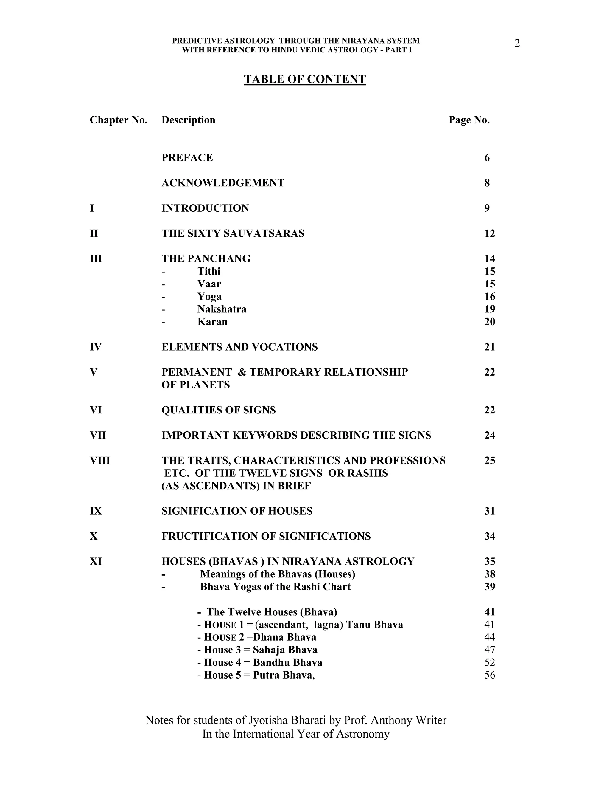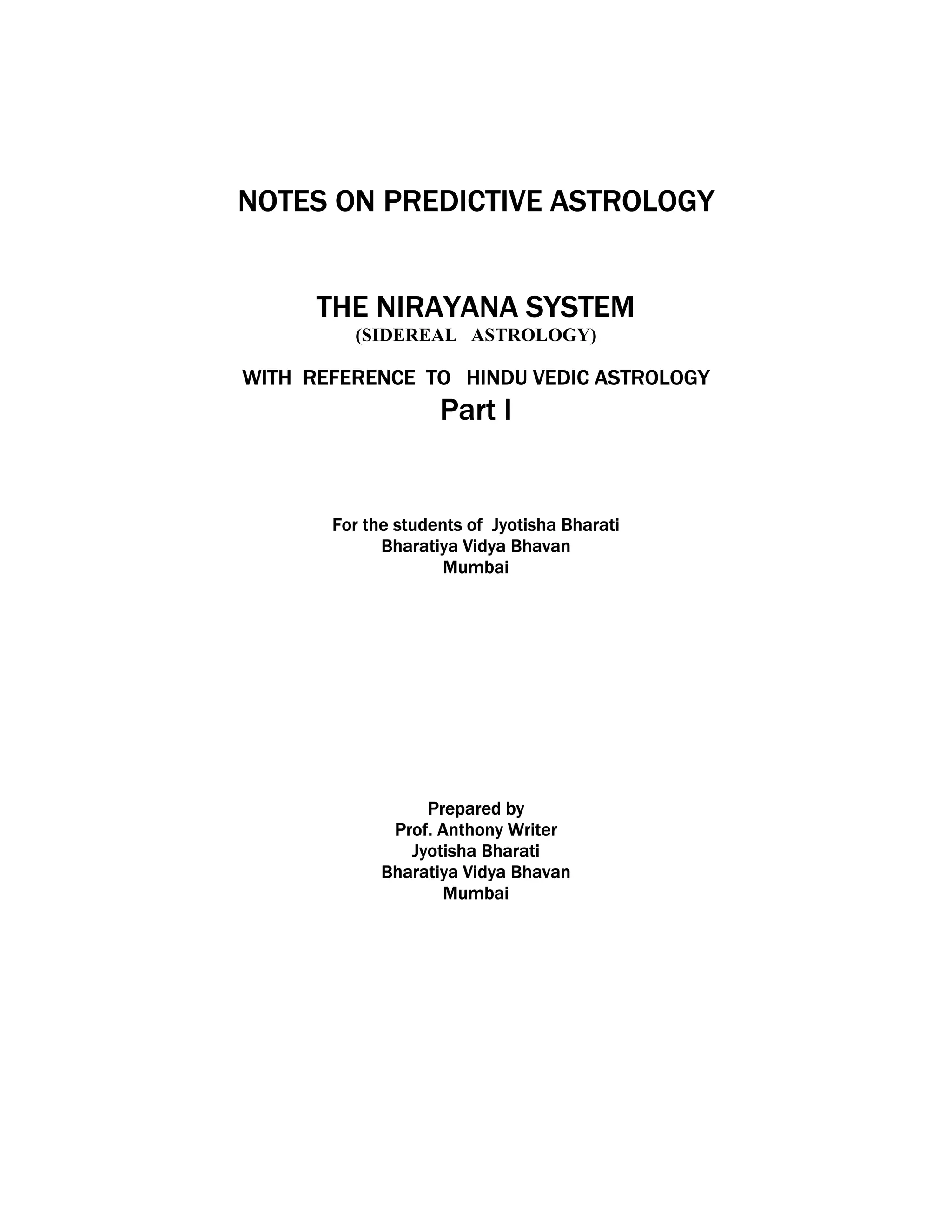 This document provides notes on predictive astrology through the Nirayana (sidereal) system with reference to Hindu Vedic astrology. It was prepared by Prof. Anthony Writer for students of Jyotisha Bharati. The notes cover topics like the panchang (including tithi, vaar, yoga, nakshatra and karan), elements and vocations, planet qualities and traits, house meanings, effects of planetary lords in houses, and descriptions of the planets in signs and houses. There are acknowledgments to teachers who assisted in the author's learning.