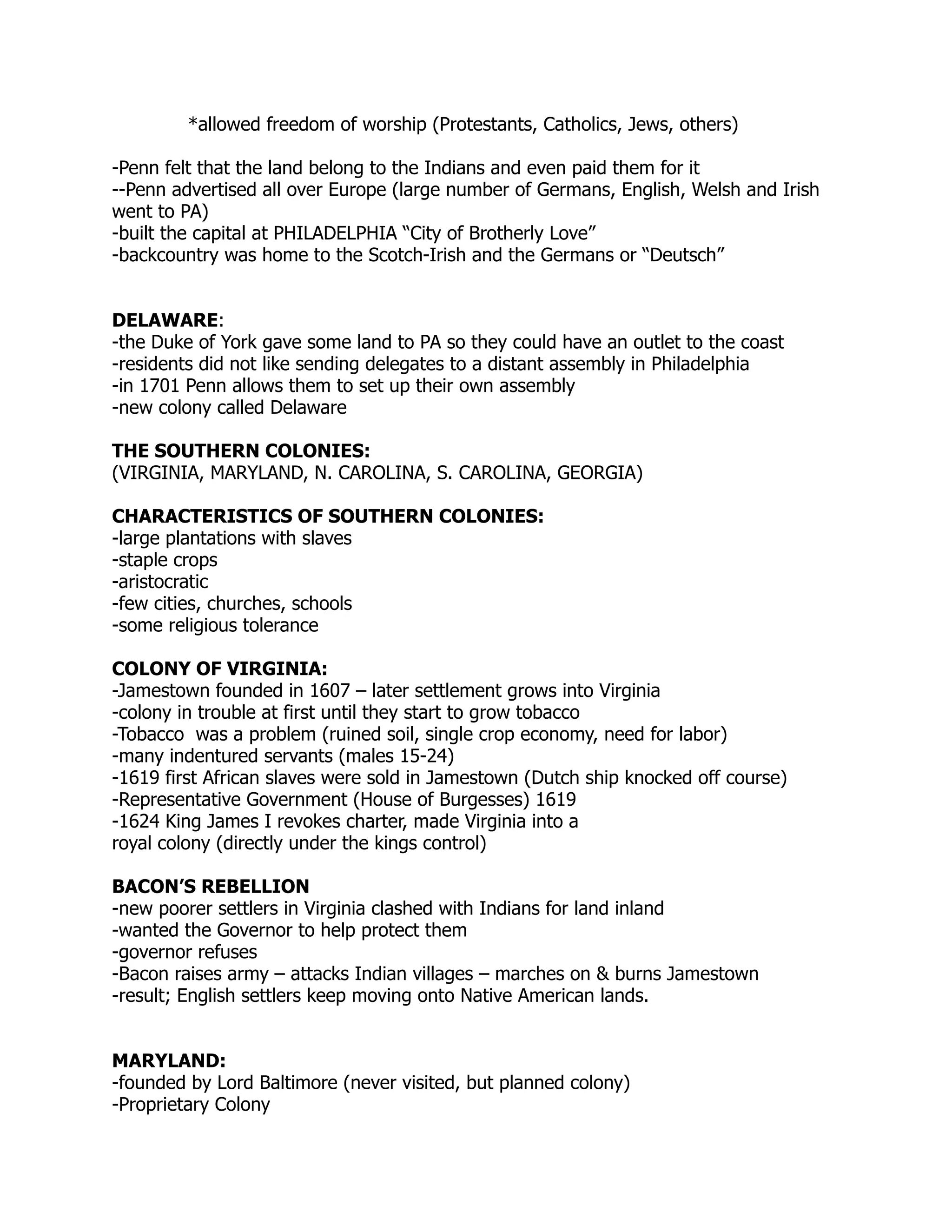 The Middle Colonies had fertile soil and grew wheat, becoming the breadbasket of America. They also had industry like ironworks, mills, and shipbuilding. New York was originally settled by the Dutch as New Netherland but was taken over by the English in 1664. New Jersey was split between East and West and attracted diverse religious and ethnic groups. Pennsylvania was founded by William Penn as a haven for Quakers and offered religious freedom and representative government. Delaware was originally part of Pennsylvania but formed its own assembly in 1701.