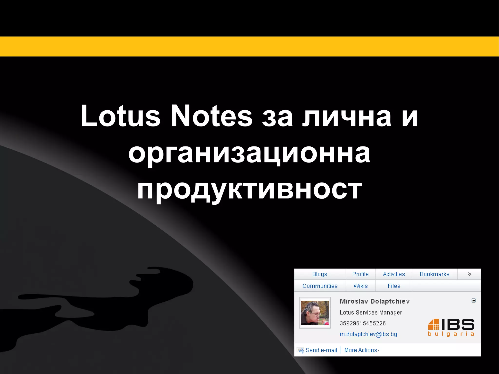 Какво МИ дава Lotus Notes? Повече от мейл клиент Общ интерфейс Сигурност Персонализация Интеграция Notebook – вашата лична база Когато технологията стане "лична" и хората стават по-продуктивни