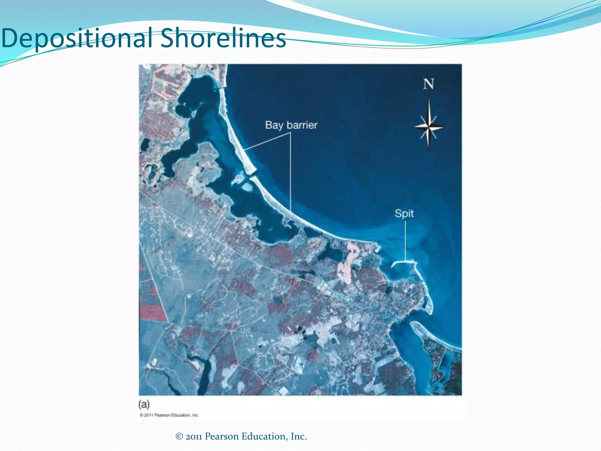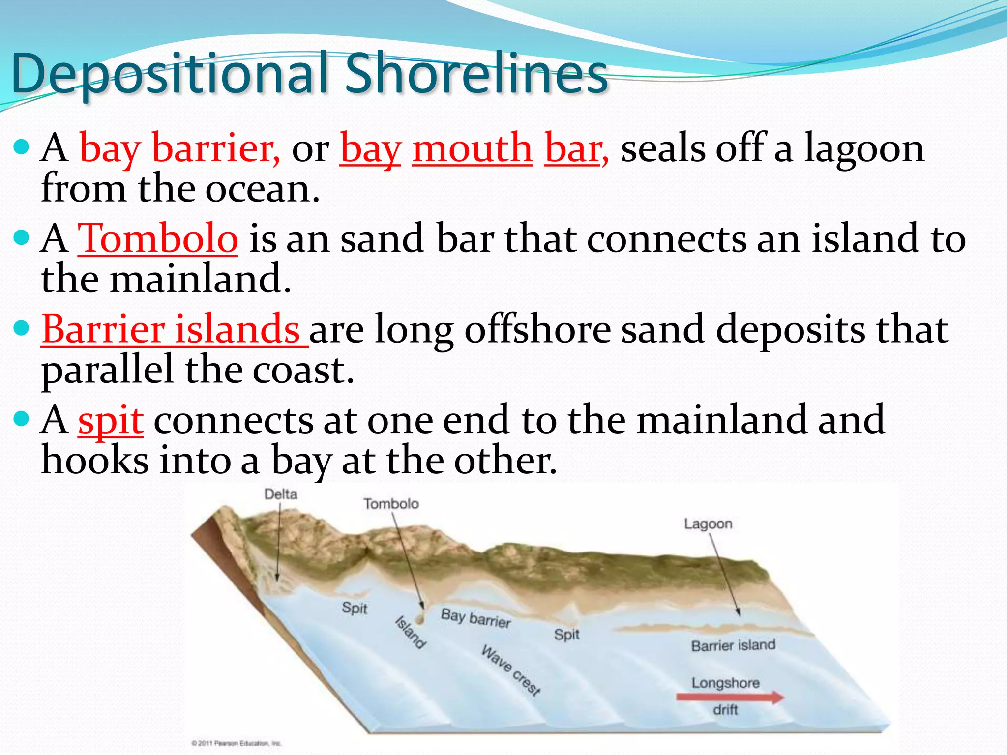 The document discusses different types of depositional shorelines including bay barriers, tombolos, barrier islands, and spits. It also describes barrier islands in more detail, including their anatomy, migration over time, and comparison to deltas and emerging vs. submerging shorelines. Finally, it covers causes of changing sea levels from local tectonics and global mechanisms like glaciation and deglaciation that impact ocean levels.