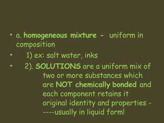 1. A solution is a homogeneous mixture of two or more substances, where the solute is evenly distributed throughout the solvent.