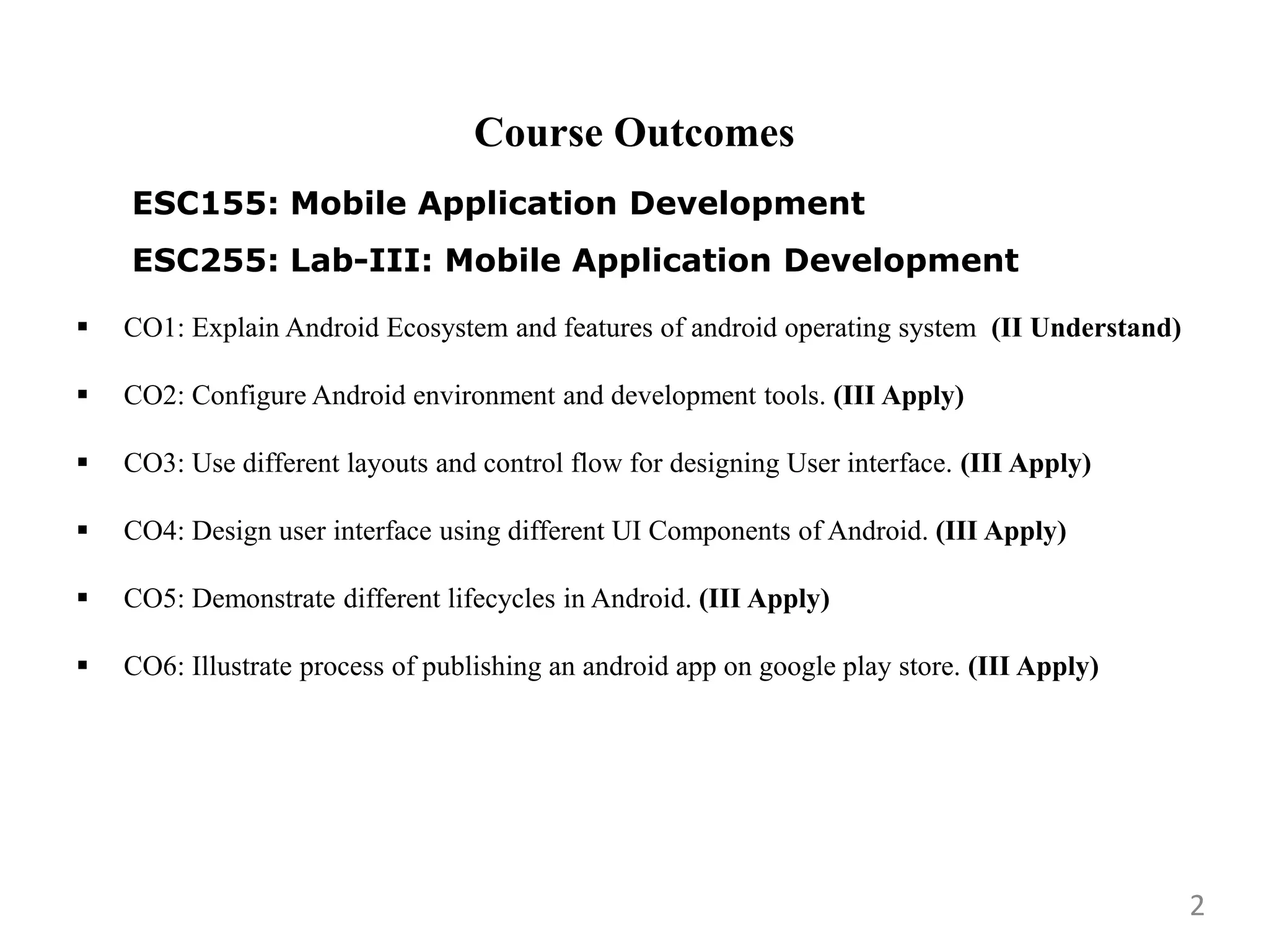 - The course teacher and outcomes which include explaining Android features, configuring development tools, designing user interfaces using layouts and components.