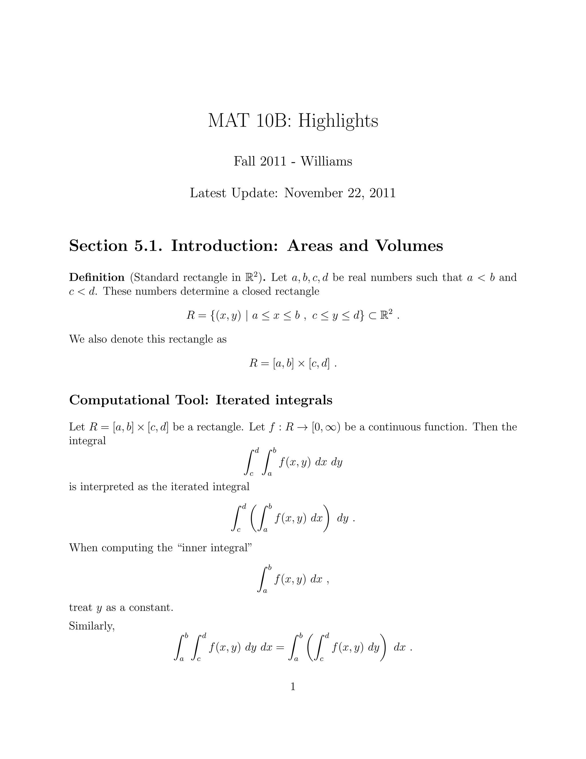 This document provides an overview of key concepts in multivariable calculus covered in MAT 10B at Williams College in Fall 2011, including: