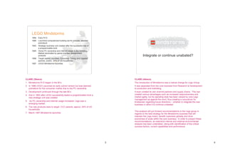 The LEGO Group document provides an overview of the company's corporate strategy, business units, leadership, and financial performance as of 1999.