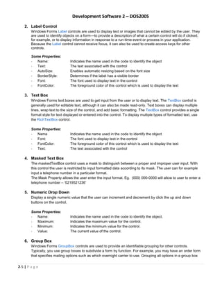 This document describes various Windows form controls that can be used to build a graphical user interface. It discusses 20 different controls including labels, text boxes, group boxes, buttons, list boxes, and open/font/color dialog boxes. For each control it provides examples of common properties like name, text, and font as well as describing the basic purpose and functionality of the control. The overall purpose is to introduce developers to the main controls available for creating Windows form applications using Visual C++.