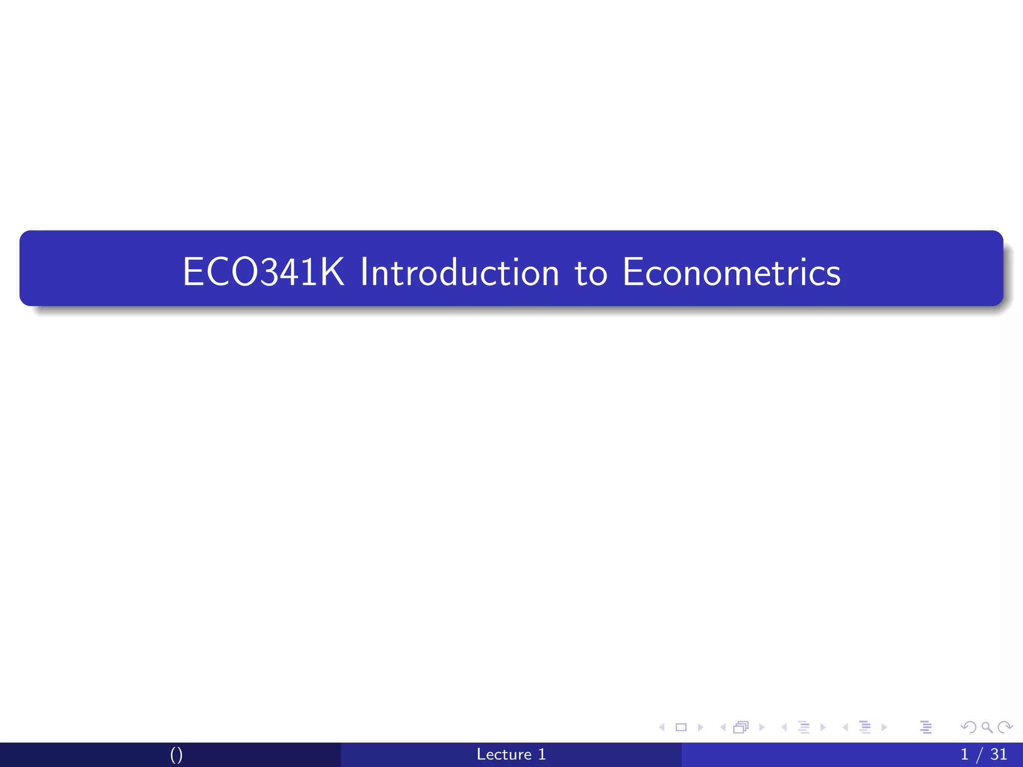 This document provides an overview and outline of an introductory econometrics course. It discusses the course objectives, which are to develop a working knowledge of econometrics and its applications. The course will cover topics like simple regression, multiple regression, and time series analysis. Students will learn to conduct their own empirical research using econometric software. The assessment will include assignments, midterms, and a final exam.