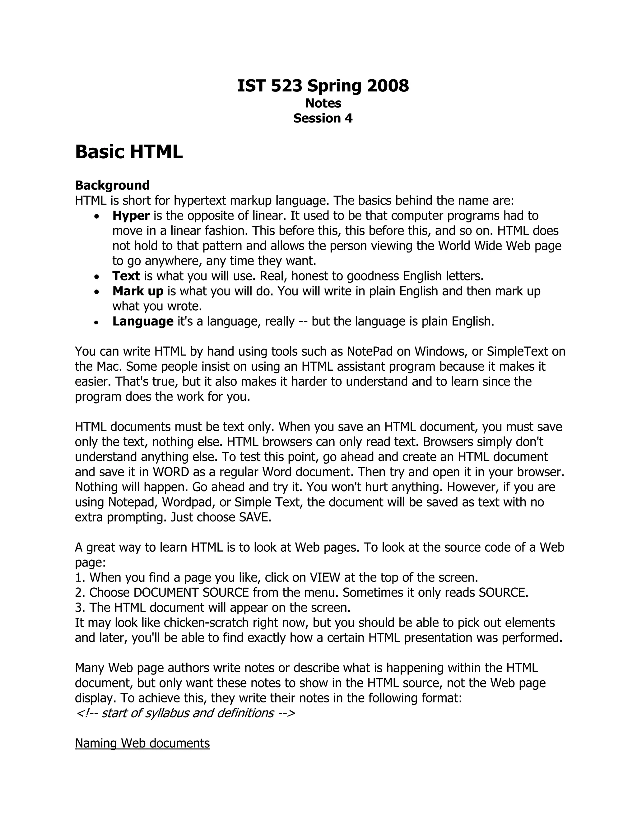 HTML is a markup language used to structure and present content on the web. It uses tags to mark elements like headings, paragraphs, and links. The document discusses basic HTML tags and syntax like <h1> for headings, <p> for paragraphs, and <a href> for links. It also covers inserting images with <img src> and applying styles with tags like <b> for bold, <i> for italic, and <font size> for text size.