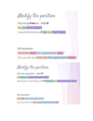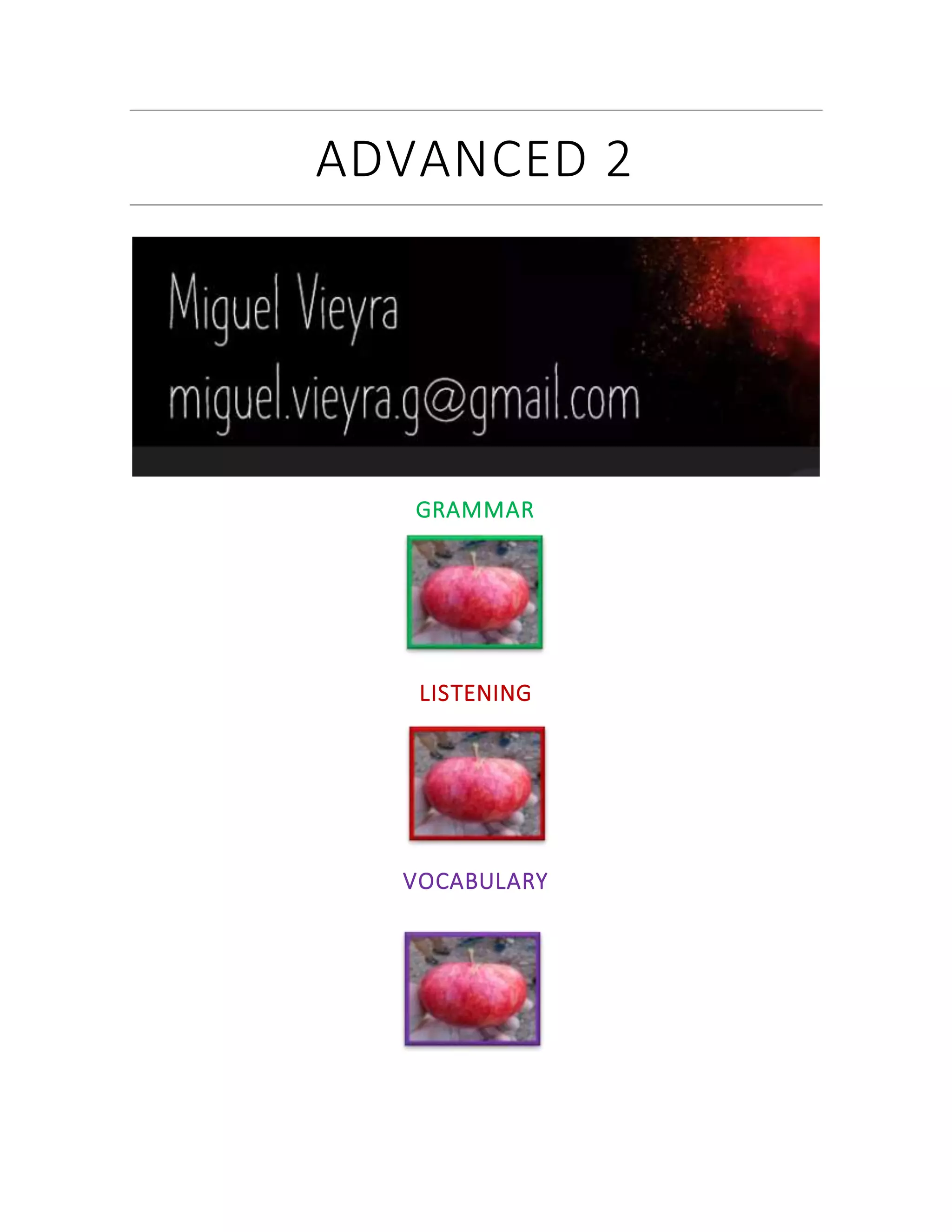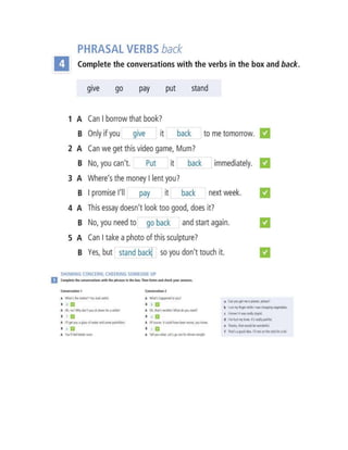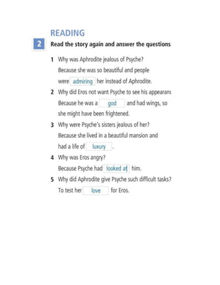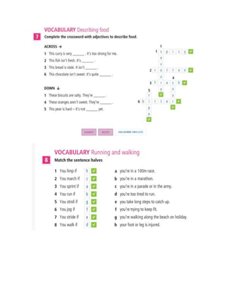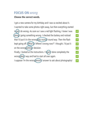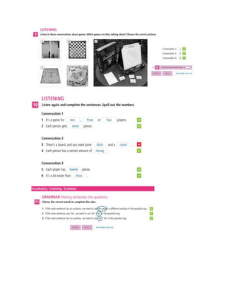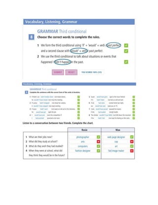 This document contains information about grammar, vocabulary, listening, and reading exercises from an English language learning session. It includes: