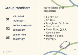 3. Different note-taking methods each have advantages and disadvantages related to speed, accuracy, and impression given to interviewees. The document provides tips for dealing with lagging behind in notes and ensuring information is captured and remembered accurately.