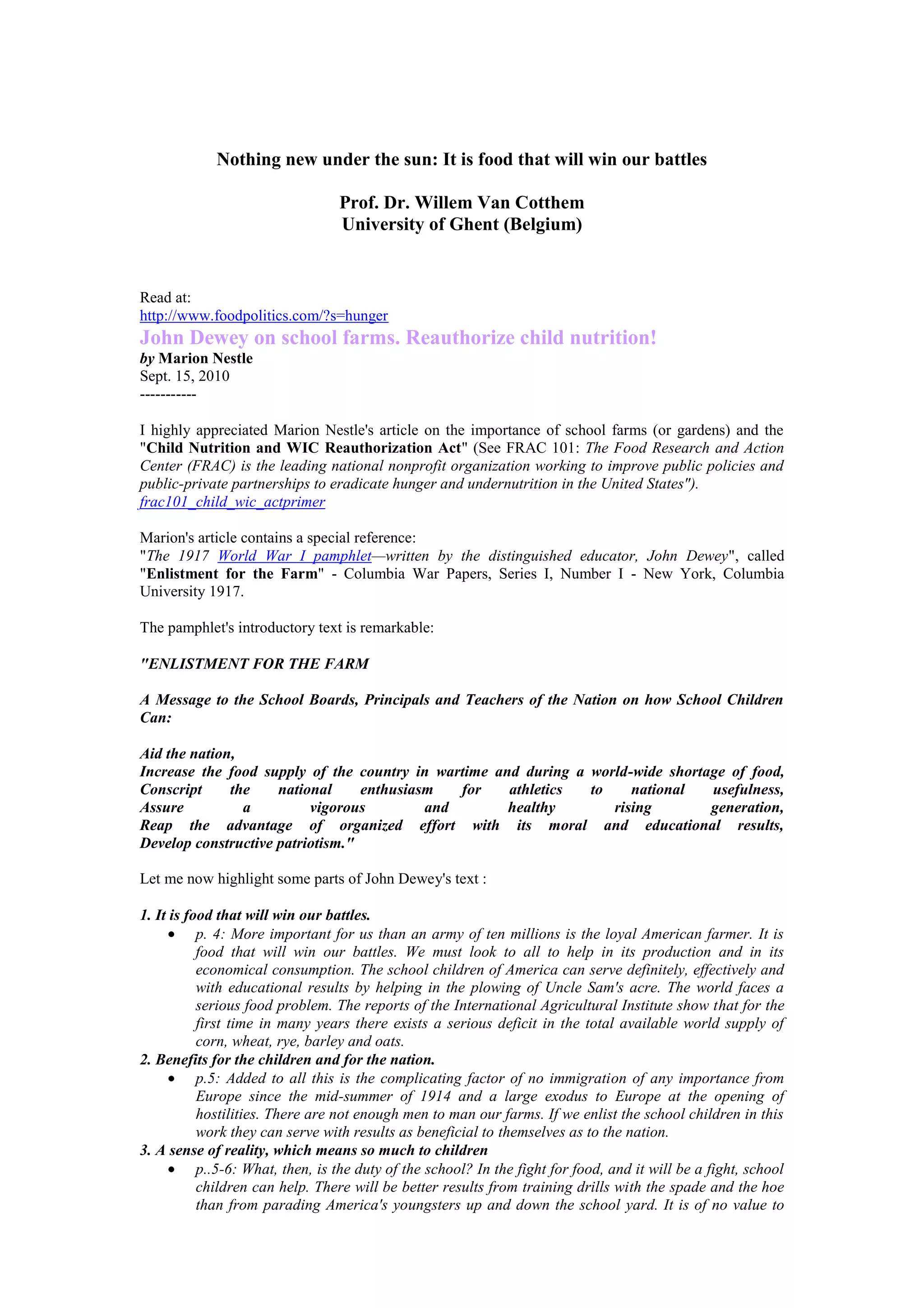 1. The document discusses John Dewey's 1917 pamphlet "Enlistment for the Farm" which argued for involving school children in food production through school farms/gardens to address wartime food shortages.