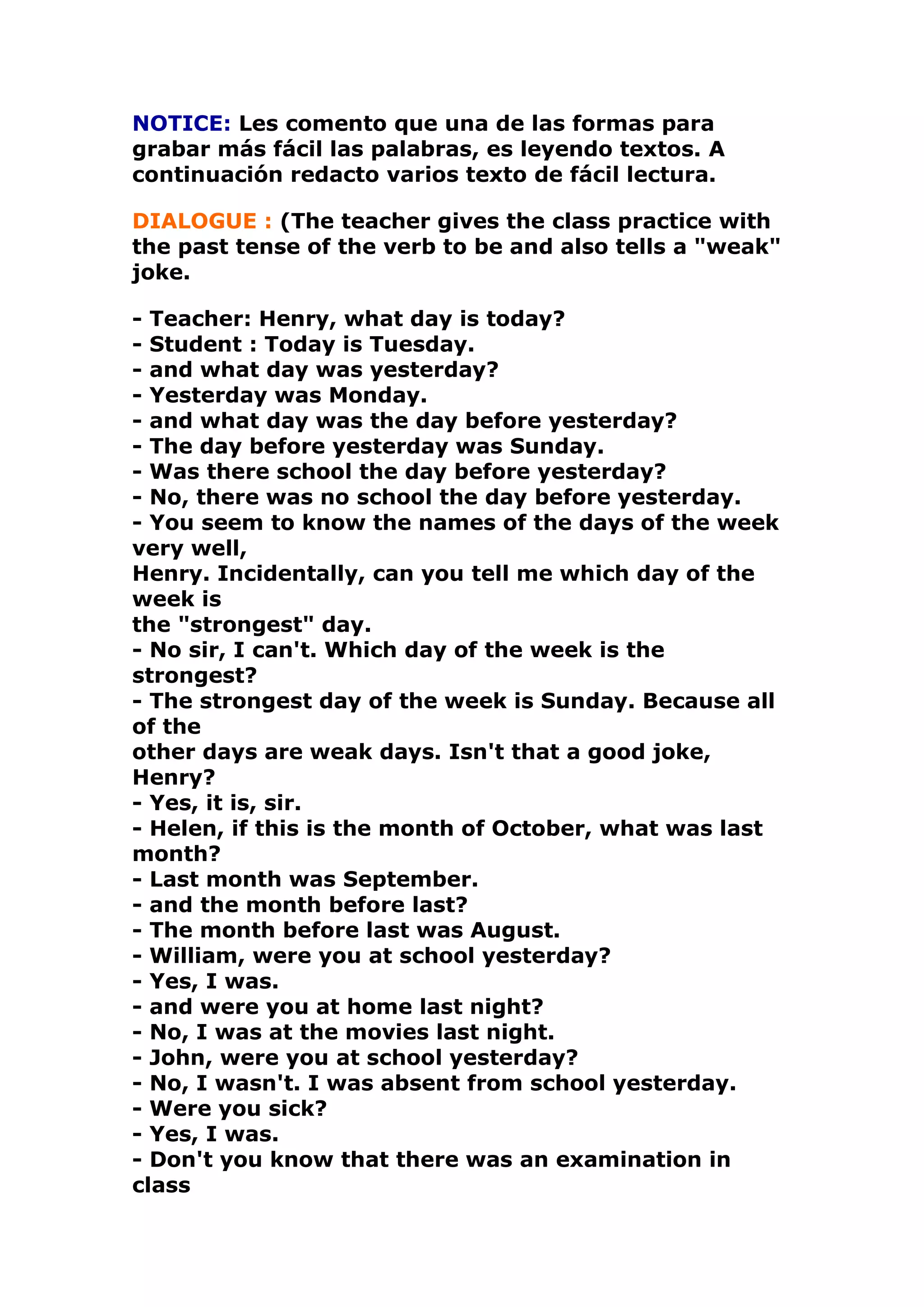 1) A dialogue practice with a teacher and students using the past tense of verbs and days of the week.