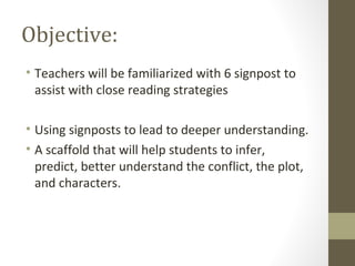 This document discusses the Notice & Note signposts strategy for close reading. It introduces six signposts - Contrast/Contradiction, Aha Moment, Tough Questions, Words of the Wiser, Again and Again, and Memory Moment. Each signpost is accompanied by clues and questions readers should ask when they encounter it. The document provides examples of modeling think-alouds using generalizable language and recommends teaching the signposts one at a time using the gradual release of responsibility model. Assessment involves listening for student conversations and reviewing graphic organizers. The conclusion states that using signposts helps students take ownership of their reading.