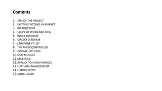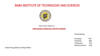 This document presents the main project report for a GSM based wireless notice board. The project aims to design an electronic notice display system that can be controlled via SMS using a GSM modem, allowing wireless and SMS-based display of information. The system will receive an SMS containing the message to display, validate the sender, and display the text on an LCD screen. The document outlines the existing market systems, scope of work, block diagram, circuit diagram, components, microcontroller, display unit, GSM module, MAX232 IC, applications, advantages, disadvantages, potential enhancements, future scope, and conclusions.