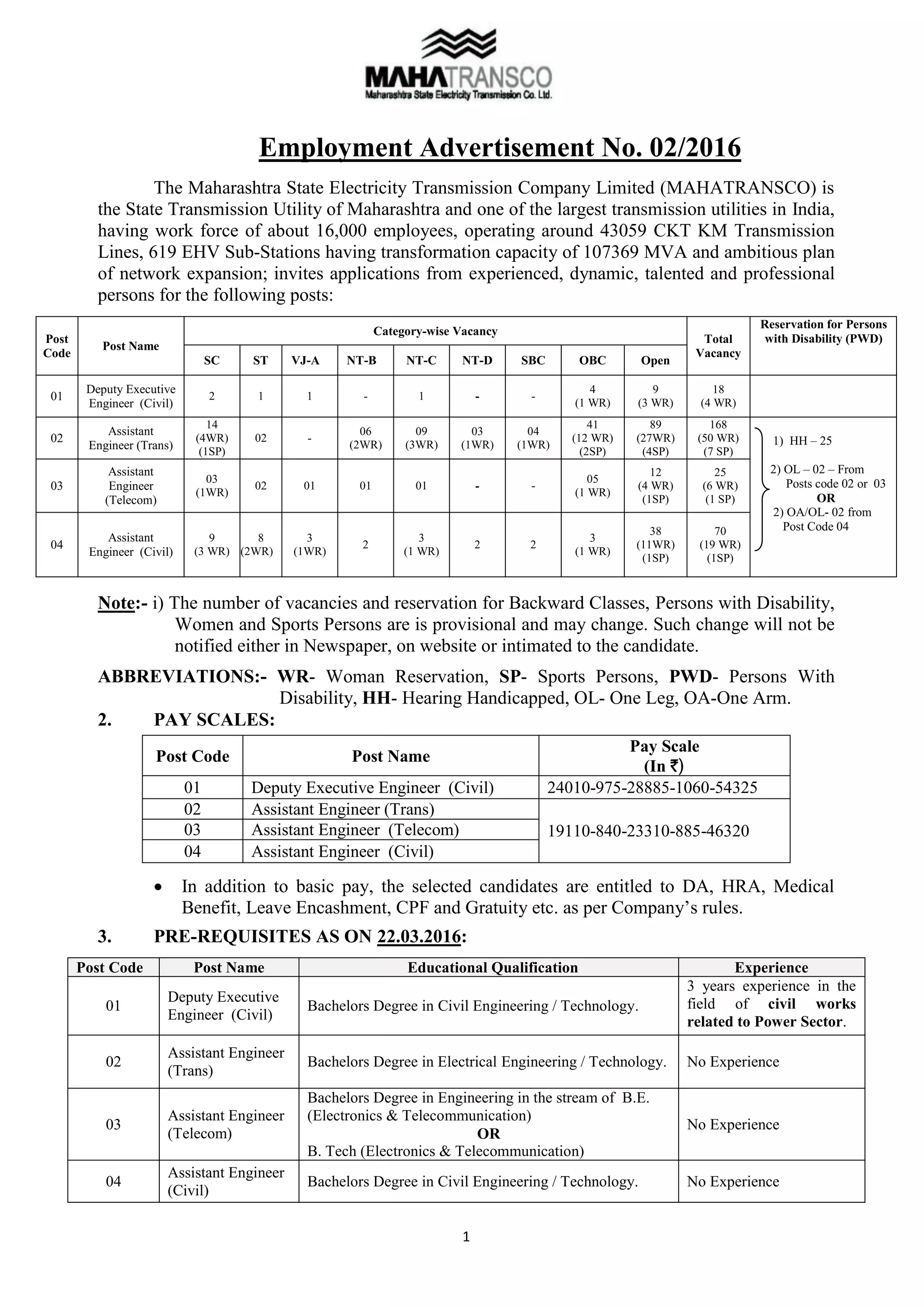 This document announces employment opportunities at MAHATRANSCO, the state electricity transmission utility of Maharashtra, India. It lists various open positions, their pay scales, required qualifications and experience, number of vacancies, and reservation details. Key positions include Deputy Executive Engineer (Civil) and Assistant Engineers in Transmission, Telecom and Civil. The selection process will involve an online written test and personal interview for Deputy Executive Engineer, and only a written test for Assistant Engineer roles. The document provides details on application fees, age limits, reservation policies, and how to apply online, along with important dates and exam center details.