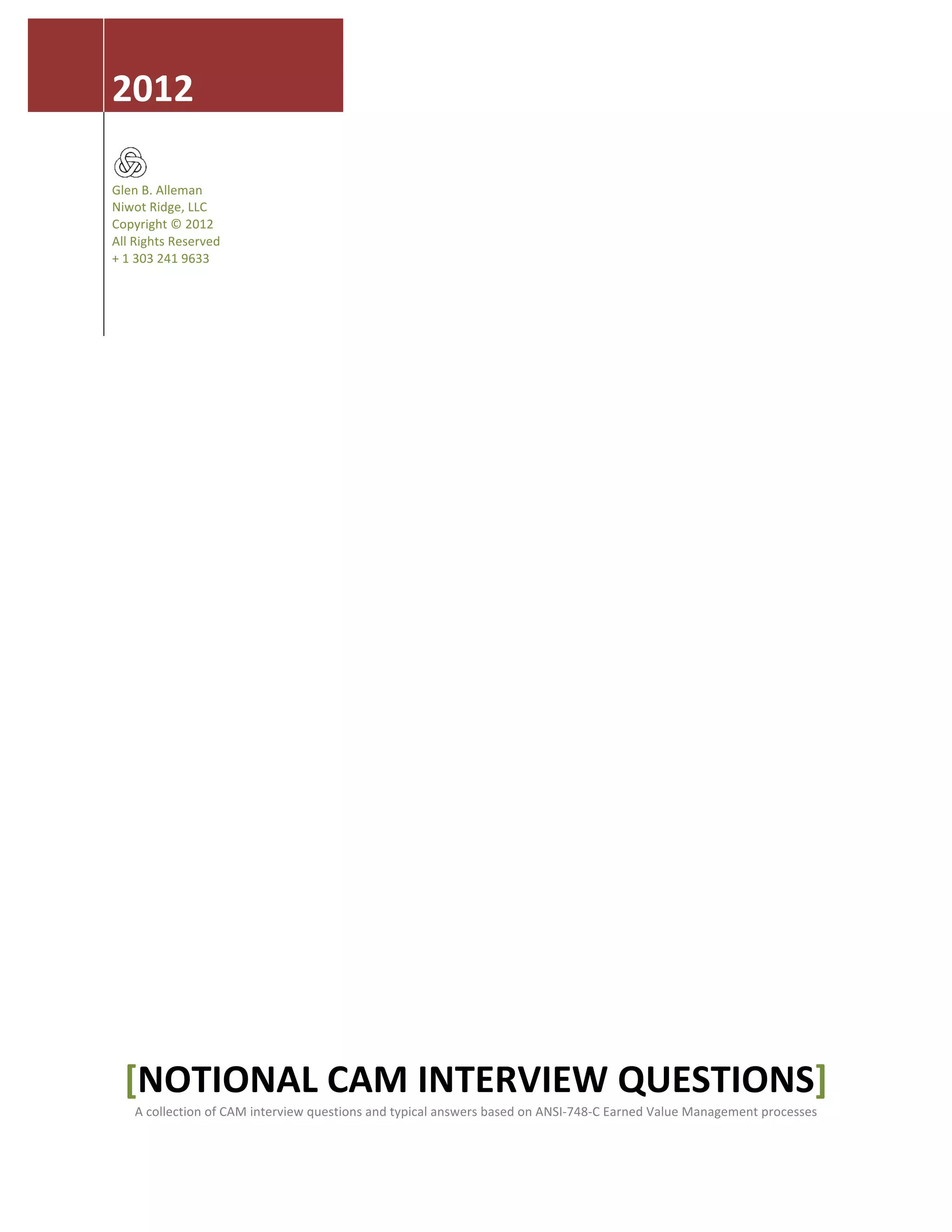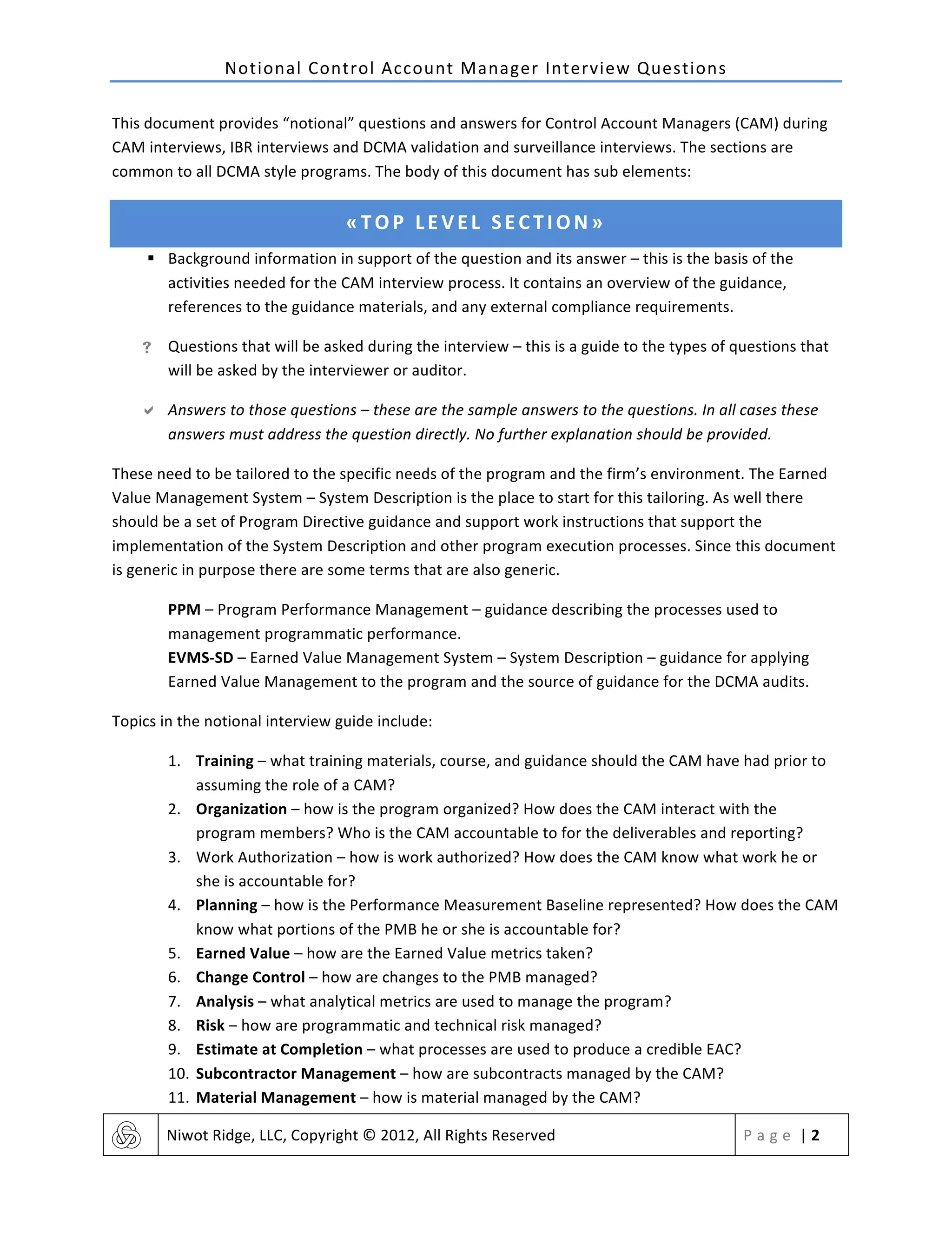 This document provides sample questions and answers that a Control Account Manager (CAM) could expect to encounter during an interview related to their Earned Value Management responsibilities. It includes background on topics like required training, the program organization structure, work authorization processes, performance measurement baseline planning, and earned value measurement. Sample questions are provided on each topic along with potential answers the CAM could provide to demonstrate their knowledge and management of their control accounts.