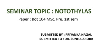 - Notothylas is a genus of hornworts classified in the division Bryophyta. It reproduces both sexually through spores and vegetatively through parts of the thallus.