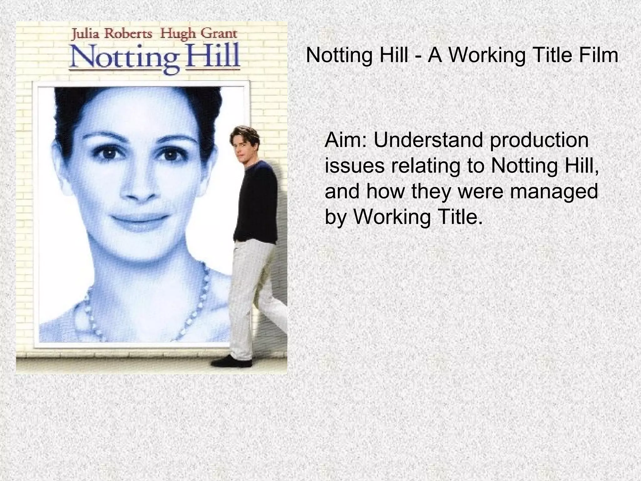Notting Hill was a romantic comedy produced by Working Title in 1999 starring Hugh Grant and Julia Roberts. While risky given it was early in Richard Curtis's career, it benefited from Grant and Curtis's previous successful collaborations as well as Roberts's star power. The director, Roger Michell, was chosen for his experience with romantic adaptations. Though the producer had success with Four Weddings, Notting Hill's budget of $33 million still posed financial risks for Working Title.