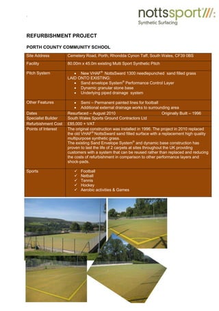 This document provides information on multiple synthetic multi-use games areas (MUGAs) that were installed at various locations in the UK. It describes the site addresses, clients, dimensions, playing surface systems, contractors, costs and sporting applications for each MUGA project. The playing surface systems generally included a stone base, sand envelope system, VHAF and NottsSward sand-filled synthetic grass. The MUGAs supported a variety of sports including football, netball, tennis and hockey.