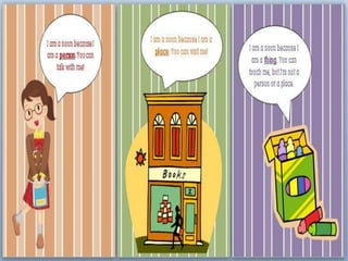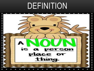 The document defines different types of nouns including common and proper nouns, collective nouns, abstract and concrete nouns, countable and uncountable nouns, and singular and plural nouns. It provides examples for each noun type to illustrate the definitions.