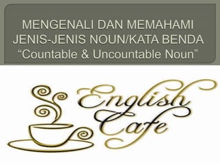 Dokumen tersebut membahas perbedaan antara countable noun dan uncountable noun. Countable noun adalah kata benda yang dapat dihitung seperti meja, kursi, botol, sedangkan uncountable noun adalah konsep abstrak yang tidak dapat dihitung seperti air, musik, informasi. Countable noun dapat berbentuk jamak atau tunggal dan menggunakan artikel a/an, sedangkan uncountable noun selalu dalam bentuk tunggal dan tidak menggunakan art