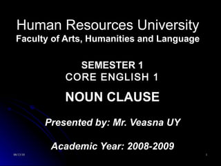 Noun clauses function as nouns and can serve different grammatical purposes within a sentence. They typically begin with words like that, which, who, when, why, how or if/whether. That-clauses use the word "that" to introduce the clause, while wh-word clauses use interrogative words like who, what, when. If/whether-clauses are dependent clauses formed from yes/no questions using if or whether. Noun clauses can serve as subjects, objects, complements, and appositives within sentences.