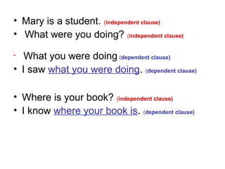 This document discusses noun clauses and their characteristics. It defines a clause as having a subject and verb, and distinguishes between independent clauses, which can stand alone as sentences, and dependent clauses, which must be part of an independent clause. Noun clauses function like nouns and can serve as subjects or objects within sentences. The document provides examples of noun clauses introduced by question words like what, where, when, etc. and demonstrates how they are used in sentences.