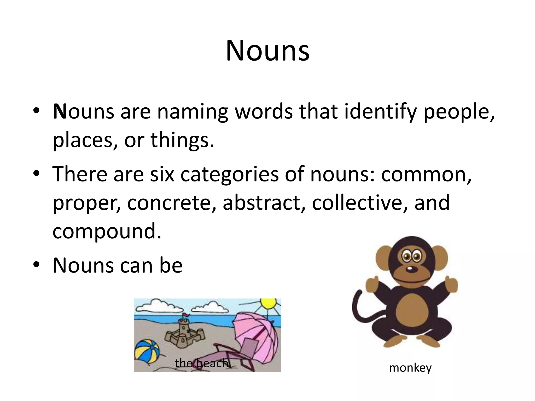 Nouns are namingwords that identify people, places, or things.There are six categories of nouns: common, proper, concrete, abstract, collective, and compound. Nouns can be Nounsthe beachmonkey
