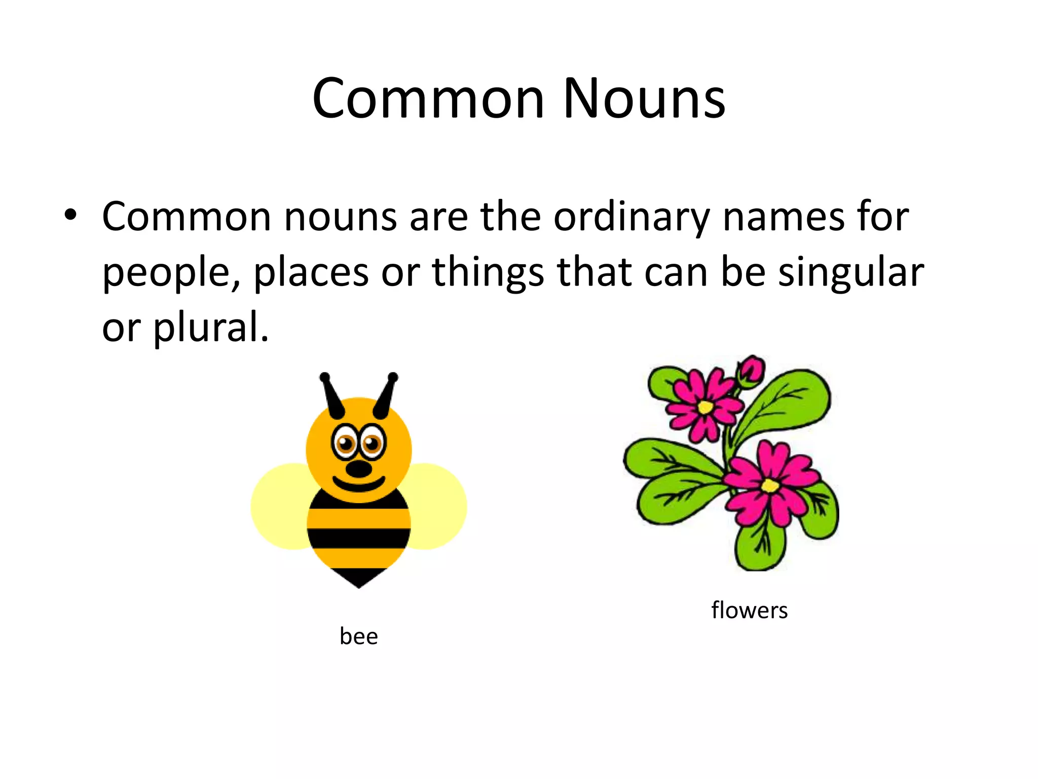 Common nouns arethe ordinary names for people, places or things that can be singular or plural.Common Nounsflowersbee