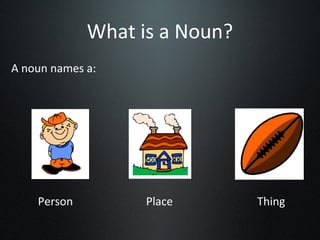 This 1st and 2nd grade LA lesson teaches students about nouns by defining nouns as naming a person, place, or thing. It includes examples of sentences with nouns and prompts students to identify the noun in each sentence. The lesson emphasizes that nouns are everywhere and encourages students to look around the room to find different types of people, places, and things.