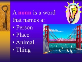 The document defines and provides examples of different types of nouns: common nouns name persons, places, animals or things in general while proper nouns name specific persons, places, animals or things. Collective nouns name groups of people, places, animals or things and abstract nouns name qualities or states of mind. It then provides examples asking the reader to identify the type of noun in each sentence.