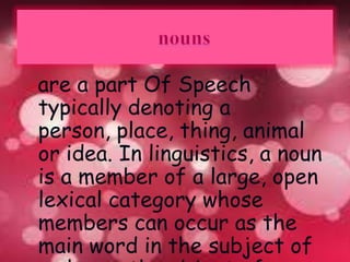 Nouns are a part of speech that refer to people, places, things, animals or ideas. Nouns can occur as the subject of a sentence. They are defined by the grammatical categories they belong to, such as gender, case and number, though these categories vary between languages. Nouns are often a single stem but can be formed from other words by adding prefixes and suffixes. In some languages, nouns are assigned a gender which requires related words like articles to agree.