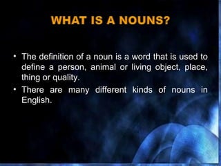 The document defines and provides examples of different types of nouns in English including common nouns, countable nouns, uncountable nouns, collective nouns, proper nouns, concrete nouns, and abstract nouns. It explains the key characteristics of each type of noun such as how they are formed in singular and plural versions and whether they can be counted or represented by numbers.