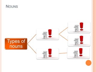 2. Collective nouns refer to a group of individuals and compound nouns are made of more than one word. Concrete nouns can be experienced by the senses while proper nouns name specific people or places and are always capitalized.
