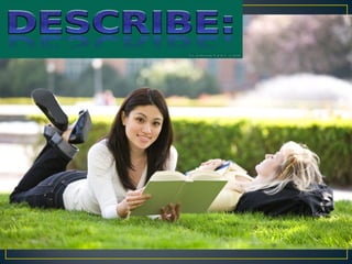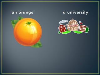 The document discusses rules for using articles (a/an) with singular and plural nouns in English. It explains that "an" is used with words beginning with vowels (a, e, i, o) while "a" is used with words starting with a consonant sound or a vowel sound like "y". It also covers plural nouns, noting that most nouns form the plural by adding -s, while some nouns have irregular plural forms.