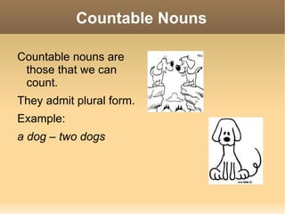 Countable nouns can be counted and take plural forms like dogs, while uncountable nouns cannot be counted and have no plural form, like water or information. Some nouns can be either countable or uncountable depending on whether they refer to individual items or a mass or quantity, for example lemonade can be countable when referring to glasses or uncountable when referring to the drink in general. The words "some" and "any" are used with both countable and uncountable nouns to refer to indefinite amounts, with "some" typically used in affirmative sentences and "any" in negative and interrogative sentences.