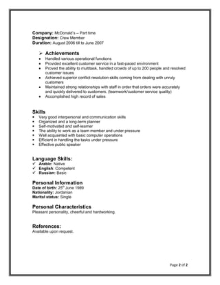 Nour Mustafa Bukhari is seeking a job that allows him to gain knowledge and experience while using his strong educational background in accounting. He has a bachelor's degree in accounting from Hashemite University with honors and awards. His previous experience includes data analysis at Umniah Telecom and work as a crew member at McDonald's, where he received an award for his performance. He has strong communication, organizational, and computer skills.