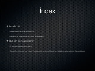- Els cinc Principis dels nous mitjans: Representació numèrica, Modularitat, Variabilitat, Automatització, Transcodificació