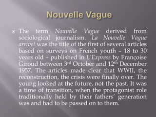 The document discusses the origins and key aspects of the French New Wave film movement known as the Nouvelle Vague. It traces the term back to sociological articles in the late 1950s discussing French youth and a transition of roles between generations. It then outlines three interlocking axes that defined New Wave cinema - authorship that elevated directors, cinephilia influenced by a love of film especially Hollywood, and new representations in narrative and style. The document also summarizes the tenets of the Nouvelle Vague like challenging conventions and establishing cinema as an artistic expression rather than just entertainment. It provides context on the Tradition of Quality films that preceded the New Wave and influences like Cinephilia and Astruc's notion of the