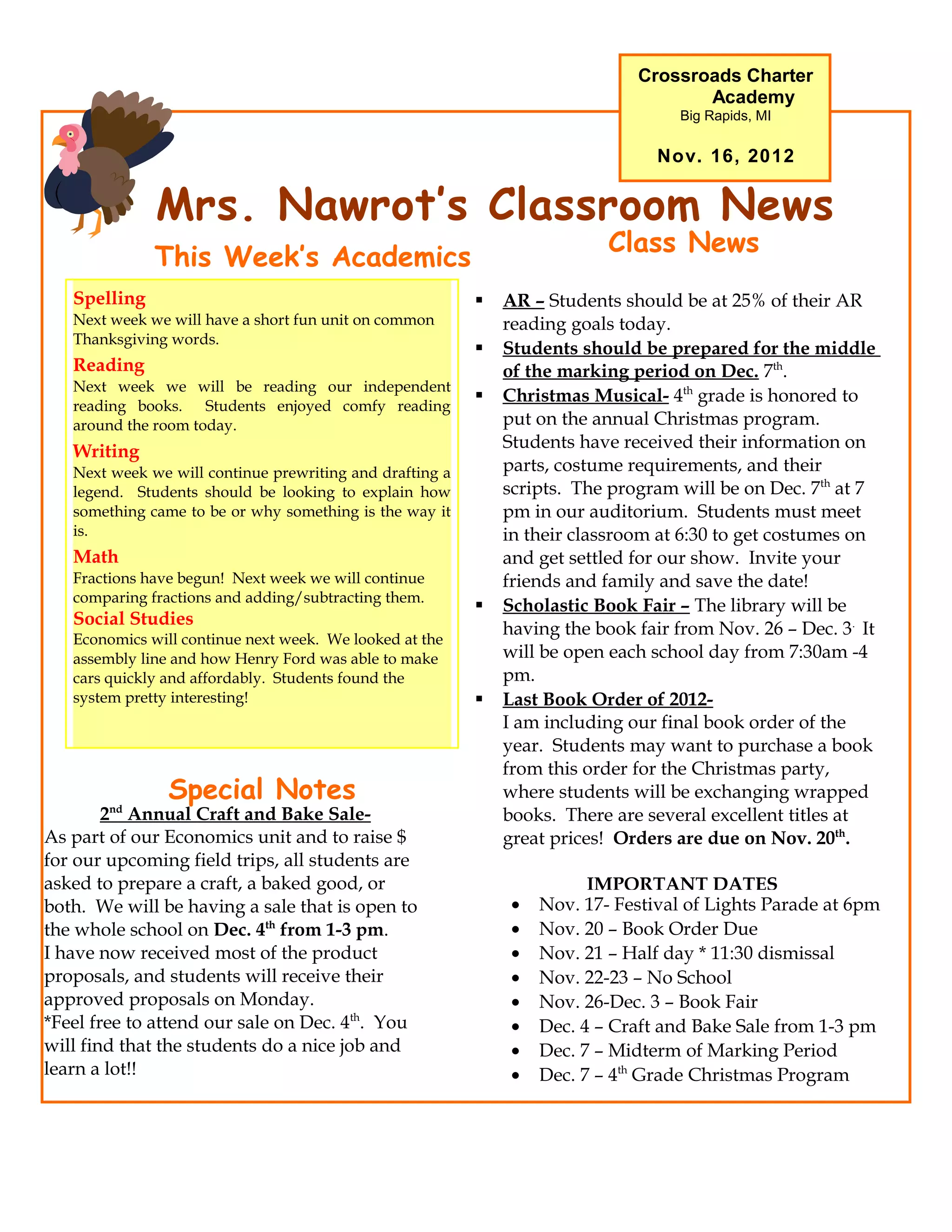 The document provides updates from Mrs. Nawrot's classroom, including information about upcoming spelling and reading units, the 4th grade Christmas musical on December 7th, an upcoming scholastic book fair, and important dates such as a craft and bake sale on December 4th to raise money for field trips.