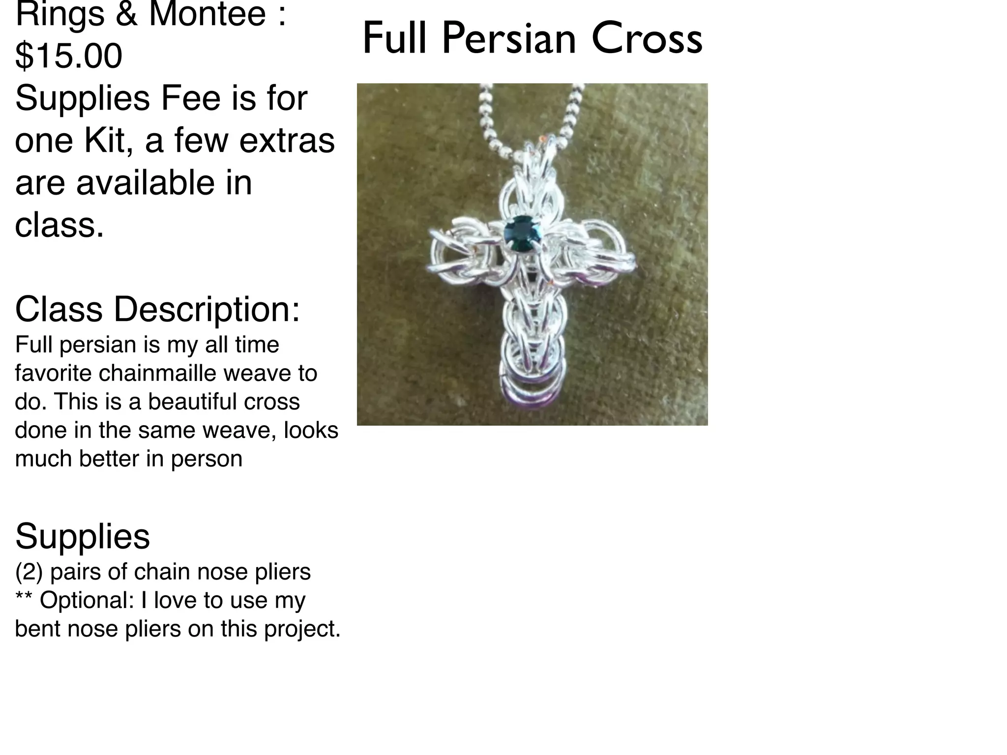 This document describes a class for making a full persian cross ring using chainmaille weaving. The class costs $15 and includes supplies for one kit, with extras available. Students need two pairs of chain nose pliers and optionally bent nose pliers. The class teaches the full persian weave technique.