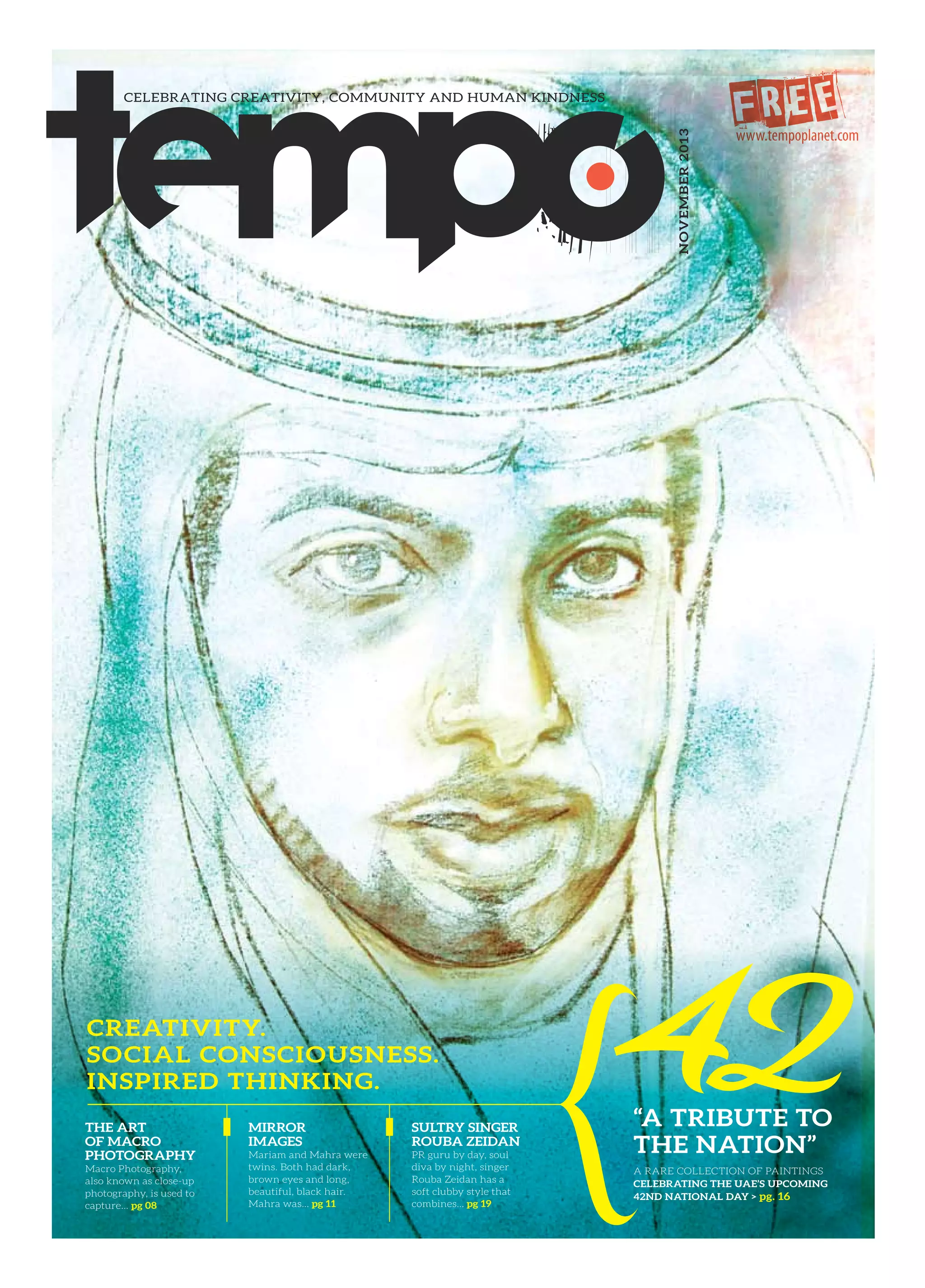 The November 2013 edition of Tempo magazine celebrates creativity, community, and social consciousness, featuring a range of topics from art and photography to music and local events in the UAE. The issue includes profiles of individuals like singer Rouba Zeidan and highlights a special collection of paintings for the UAE's national day, while also emphasizing its commitment to sustainability through the use of recyclable materials. Readers are encouraged to engage with the publication and the augmented reality app to explore interactive content.