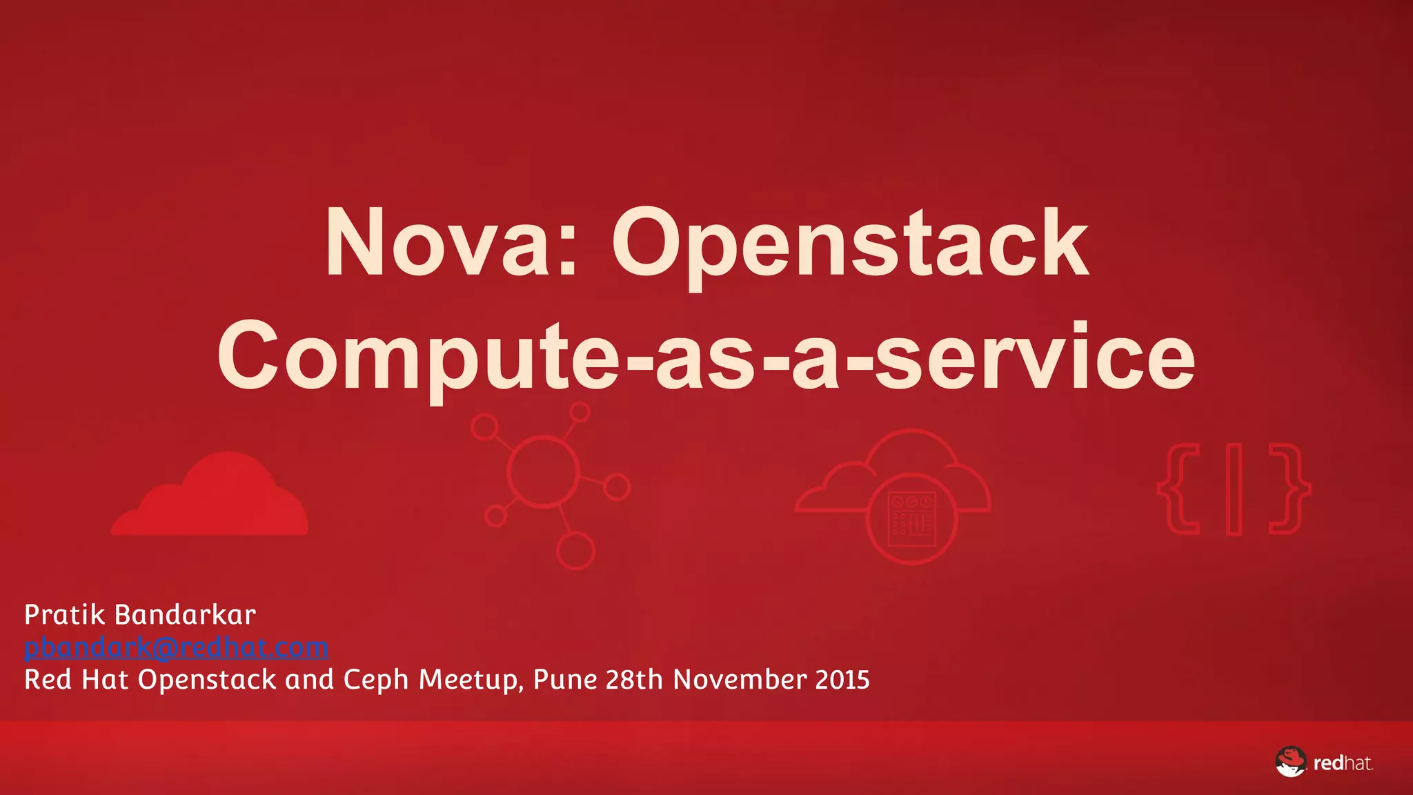 The document describes the agenda and key components discussed at the Red Hat OpenStack and Ceph meetup in Pune on November 28, 2015, focusing on the Nova project, which manages instance lifecycles in OpenStack. It details the Nova architecture, API interactions, instance spawning, and integration with other OpenStack components like Neutron and Glance. Additionally, it covers essential concepts such as flavors, keypairs, security groups, and backend storage options for instance disks.