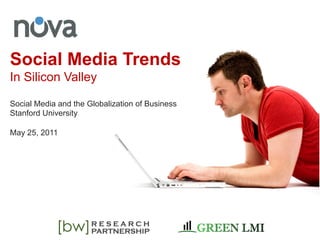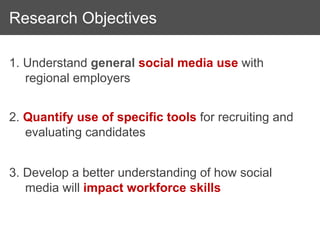 The document presents a study on social media trends in Silicon Valley, focusing on its use for recruitment and employee evaluation among employers. Key findings indicate that while social media is increasingly important for communication and recruitment, it is not yet transformational; traditional methods like referrals remain crucial. Recommendations emphasize the need for job seekers to develop a professional online profile while maintaining a cautious approach to their online presence.