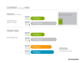 The document discusses responsive design techniques that allow digital experiences to adapt seamlessly to various devices, enhancing user experience by utilizing flexible grids, images, and CSS media queries. It emphasizes the importance of a device-agnostic approach, advocating for a 'mobile first' design philosophy while maintaining a single codebase and content platform. Key recommendations include prioritizing content, testing on devices, and ensuring effective communication between design and development teams.