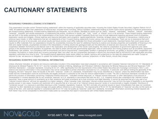 The document discusses Novagold's key projects, particularly the Donlin Gold project, which is highlighted as a significant undeveloped gold resource. It emphasizes forward-looking statements and uncertainties involved in mining operations, including risks related to financing, geological interpretation, and regulatory permitting. The gold industry is facing a decline in reserve grades, necessitating the development of large mines like Donlin Gold to maintain production levels.