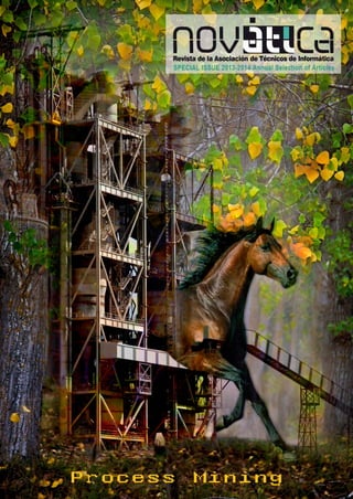 Novática is the oldest Spanish periodical focused on information and communication technology, published by the Association of Computer Technicians (ATI) since 1975. The document highlights its goals for internationalization, member services, communication, sustainability, professionalism, and networking following recent organizational changes. It also emphasizes the importance of process mining as a transformative approach for managing digital information overload in business.