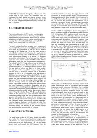 The document presents a novel model for securing PIN entry during credit card transactions in crowded public places, addressing vulnerabilities related to shoulder-surfing and video recording attacks. It proposes using a user's mobile phone for PIN entry, which keeps the PIN hidden from observers and enhances security against various attacks during offline transactions. The model provides flexibility for users to choose their preferred method of PIN entry while ensuring that the actual PIN is never revealed during the transaction.