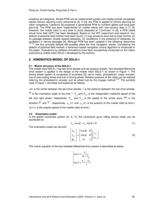 This document presents a novel behavior-based navigation strategy for autonomous mobile robots, addressing the limitations of the widely-used potential field method (PFM) in obstacle avoidance. The authors developed a kinematics model for the mobile robot sdlg-1, employing twelve sonar sensors to implement an effective navigation algorithm, which was validated through software simulations and experiments. The approach integrates multiple behavior modules, including follow-wall, avoid-obstacle, and move-to-goal, to enhance the robot's navigation capabilities in dynamic environments.