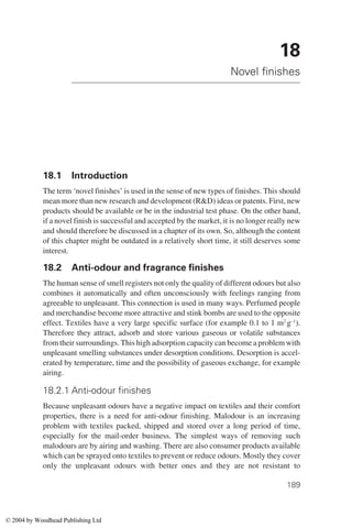 The document discusses novel finishes for materials, including anti-odor and fragrance finishes. It defines novel finishes as new types of finishes that have progressed beyond the research phase and are either available or undergoing industrial testing. While the content may become outdated quickly if finishes become successful, the chapter aims to describe finishes that are still relatively new to the market. It begins discussing anti-odor and fragrance finishes that not only neutralize bad smells but can impart a pleasant scent.